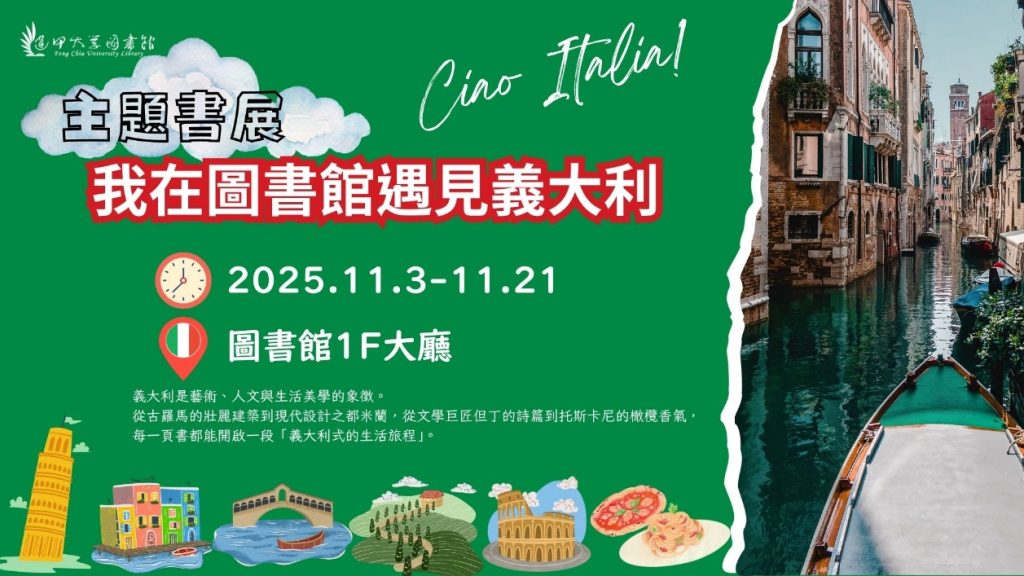 本次書展以「閱讀作為旅行」為概念,邀請師生一起透過文字與圖像探索義大利的建築、文化、文學與美食,感受這個國家獨特的風格與靈魂。