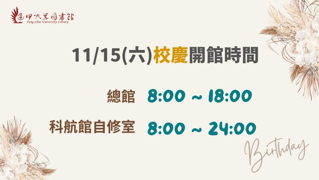 本校訂於 114 年 11 月 15 日(星期六)舉辦 64 週年校慶,圖書館開館時間異動如下,請多加利用。