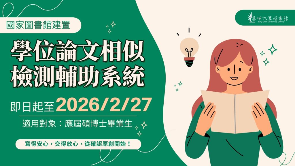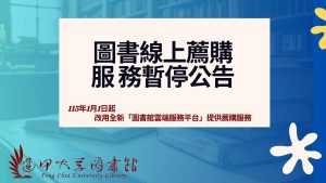 - 帳號申請:圖書館流通櫃台(分機 2682),或 library@o365.fcu.edu.tw。