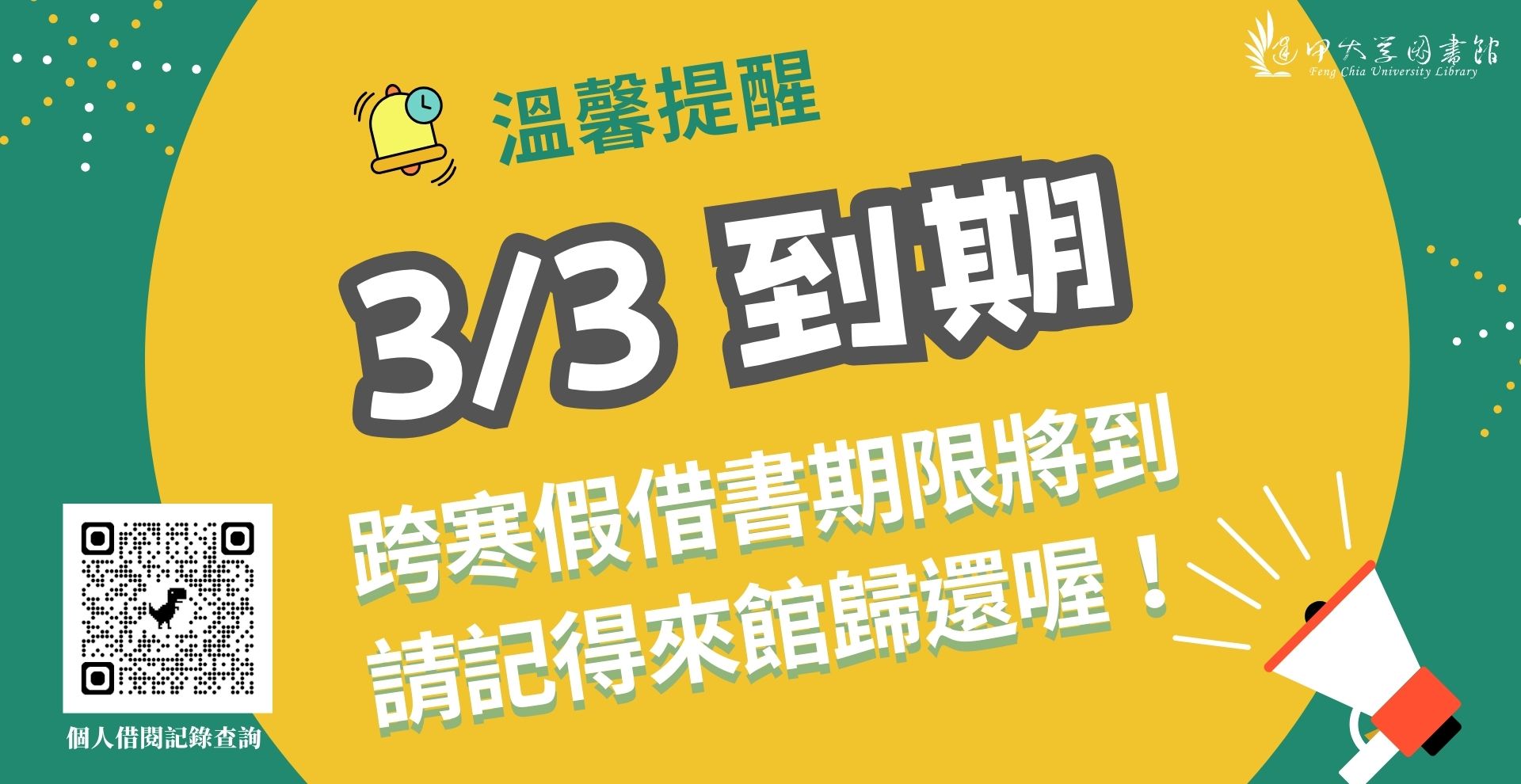 【開學提醒】您的愛書該回圖書館報到囉!26 2 月, 2026一般公告 新學期開始,提醒您跨寒假借閱圖書將於3/3到期,請記得歸還或辦理續借,以免產生逾期滯還金。 🔗 查看個人借閱記錄:觀看操作教學影片 上一 文章 2/27 (五) 科航館自修室開館時間調整公告