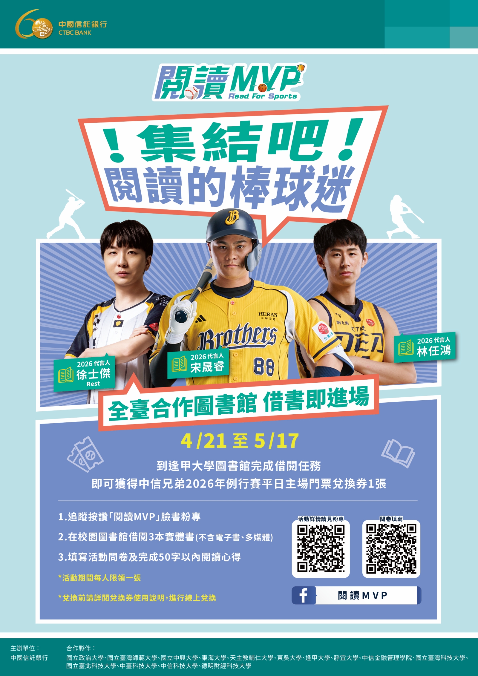- 至圖書館 1F 流通櫃台出示 (a)學生證/教職員證 (b)借書收據 (c)「閱讀 MVP」臉書粉專 追蹤按讚畫面 (d)問卷完成頁,即可獲得中信兄弟 2026 年例行賽平日主場門票兌換券1張。