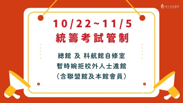6/4-6/17 圖書館配合統籌科目考試管制事宜 (Suspension of visitor access to the Main Library and Study Room from June 4-17, 2025.)